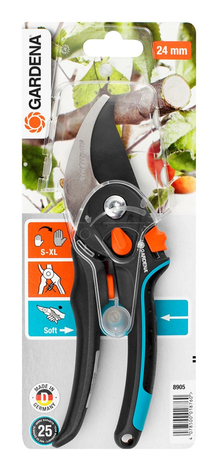 The GARDENA Comfort Secateurs with their non-stick-coated upper blade and a bottom blade made of rust-proof stainless steel are perfect for cutting flowers, young shoots and fresh wood. The extra-narrow cutting head permits particularly precise cutting. The infinite handle width adjustment and ergonomically-shaped handles provide maximum comfort when cutting. The spring is integrated into the shears so that it cannot be lost and is protected from dirt. The secateurs have a practical single-hand safety lock for safe storage. 25 year warranty.